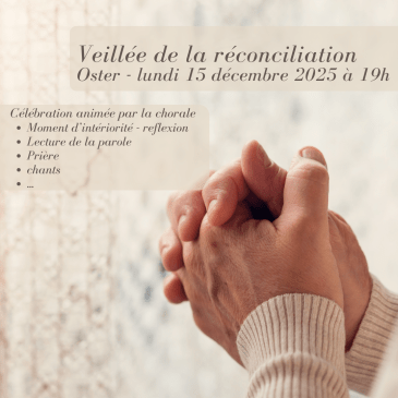 Lundi 15 décembre 2025 à 19h en l’église d’Oster Veillée de la réconciliation En vue des fêtes de Noël, un moment d’intériorité et de réflexion nous est proposé lors d’une belle veillée de la réconciliation. Au programme : Chants (par notre chorale), prière, réflexion, méditation, …. Venez nombreux !