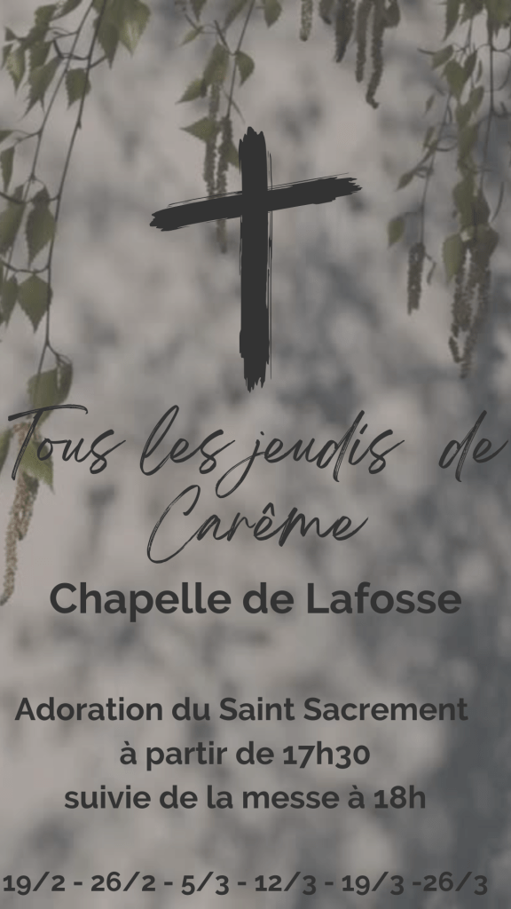 Comme les années précédentes, la chapelle de Lafosse et son groupe de prière vous accueilleront tous les jeudis à 17h30 pour l’adoration suivie de la messe à 18h.